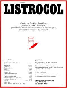Listrocol® was a complex therapeutic preparation used to detoxify and protect the liver and to stimulate appetite. This drinkable product (in ampules) contained several types of plant extracts: extracts of rhubarb, artichoke, gentian, quassia and tincture of cardamone. It contained also nicotinamide (vitamin B3), folic acid (vitamin B9), cyanocobalamine (vitamin B12) and cynarin, also known as 1,3-dicaffeoylquinic acid. This latter compound is a polyphenol abundant in artichoke (Cynaracardunculus var. scolymus L.).