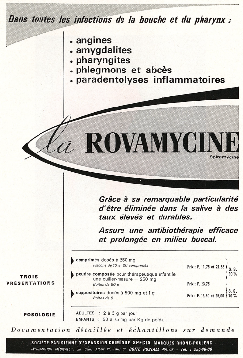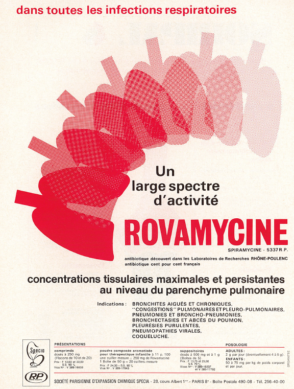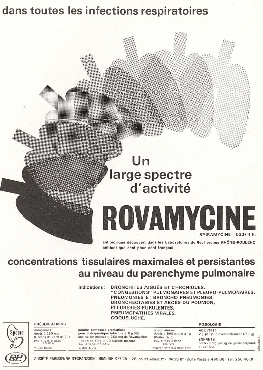 Rovamycine® is used to treat the respiratory tract infections. The adverts in the 1970s essentially reflected the benefit of the drug to treat these ENT infections and its capacity to concentrate in the pulmonary tissue.