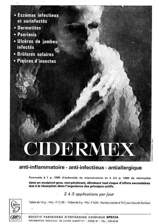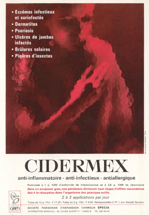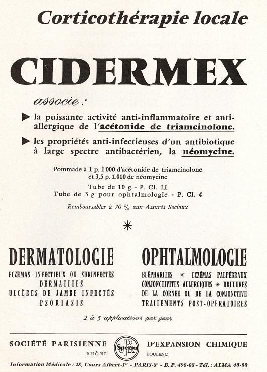This drug contained two active principles: the anti-inflammatory molecule triamcinolone acetonide which is a synthetic glucocorticoid extensively used for over 50 years, and the broad-spectrum aminoglycoside antibiotic neomycin also used for a long time in medicine. The drug combination was recommended for the treatment of various dermatological affections such as dermatosis, eczema, local psoriasis, burns, insect bites, ocular inflammation, and other types of skin damages. Cidermex® was an ointment made with a non-fat excipient, well adapted for skin application. Neomycin is an aminoglycoside with a broad-spectrum antibacterial profile. Triamcinolone acetonide is a synthetic corticosteroid which remains extensively used today in therapeutics. This drug combination is not largely used today, although there are mentions of the use of Cidermex® in ocular therapeutics, occasionally. Triamcinolone acetonide remains extensively used to treat many types of inflammatory diseases and conditions, such as allergic rhinitis for example and in several ointments for skin applications.