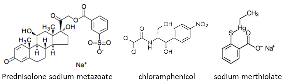 This anti-inflammatory drug contained deltahydrocortisone (better known as predsisolone) as a metasulfobenzoate ester, combined with the antibiotic agent chloramphenicol and sodium merthiolate (also known as mercurothiolate). This latter product is an organomercurial agent with antiseptic properties. Sodium merthiolate (known as Thimerosal®) is still largely used today as a preservative agent in pharmaceutical and personal care (cosmetic) products, but it represents a source of ethylmercury pollution in aquatic ecosystems.