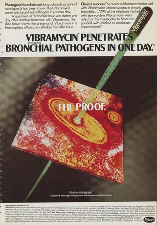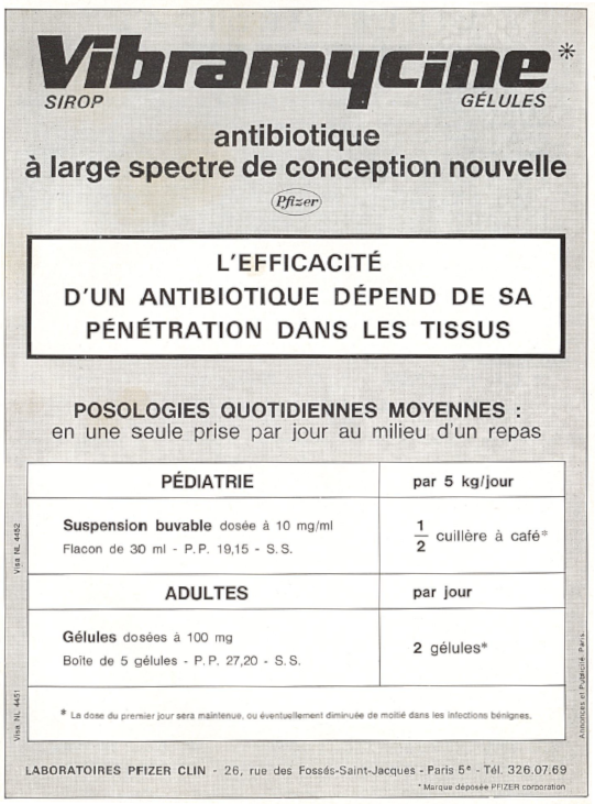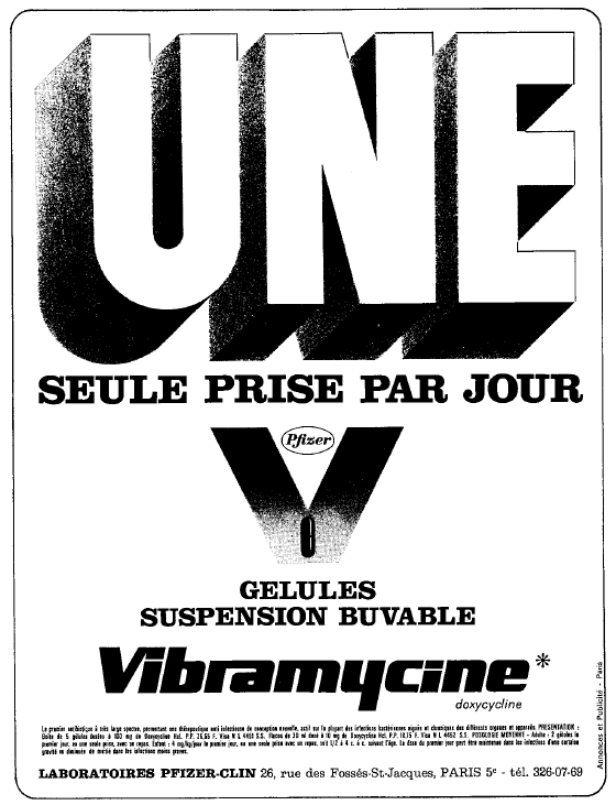 Vibramycine® (doxycycline) is a semi-synthetic tetracycline antibiotic discovered in the early 1960s in the USA (Pfizer). This drug is used for more than 60 years to treat or prevent bacterial infections. It is a first-line product to combat urinary, intestinal, genital or eyes infections. Doxycycline is active against both gram-negative and gram-positive bacteria. It is a synthetic derivative of oxytetracycline (α-6-deoxy-5-oxytetracycline), very stable in human serum. The active ingredient is commonly mixed with many different inert ingredients to formulate syrups, capsules or oral suspensions or tablets. The oral absorption of the drug is high. The mechanism of action implicates the binding of the drug substance to the 30S ribosomal subunit, thereby inducing inhibition of bacterial protein synthesis leading to bacteriostatic effects. It is active against a very broad range of bacteria, but cross resistance with other tetracyclines is common. Today, the drug remains largely prescribed to treat skin, respiratory and urinary tract infections. It is also an alternative drug, when penicillin is contraindicated, to treat sexually transmitted infections such as chlamydia, gonorrhea, and syphilis.