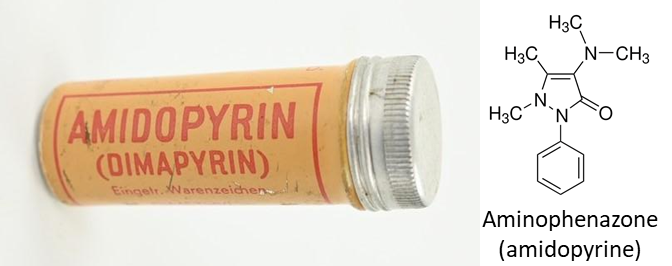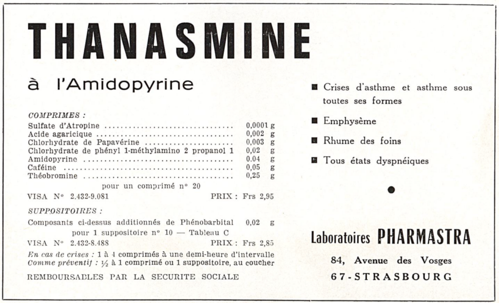 This drug was used in the 1970s to treat asthma crisis and emphysema, but also hay fever. It contained several active principles such as (i) the antispasmodic alkaloid atropine sulfate which is a muscarinic receptor antagonist, (ii) the isoquinoline alkaloid papaverine contributing to the antispasmodic effect, (iii) the related alkaloids theobromine and caffeine with psychostimulatory properties, (iv) the fatty acid agaric acid (also called agaricin), a regulator of lipid metabolism, (v) and amidopyrine (aminophenazone) with anti-inflammatory properties. Thanasmine exhibited anti-asthmatic and antidyspneic properties. Its broncholytic action was useful to treat pulmonory affections. The drug was available under two forms, oral tablets and suppositories. The drug is no longer used today.